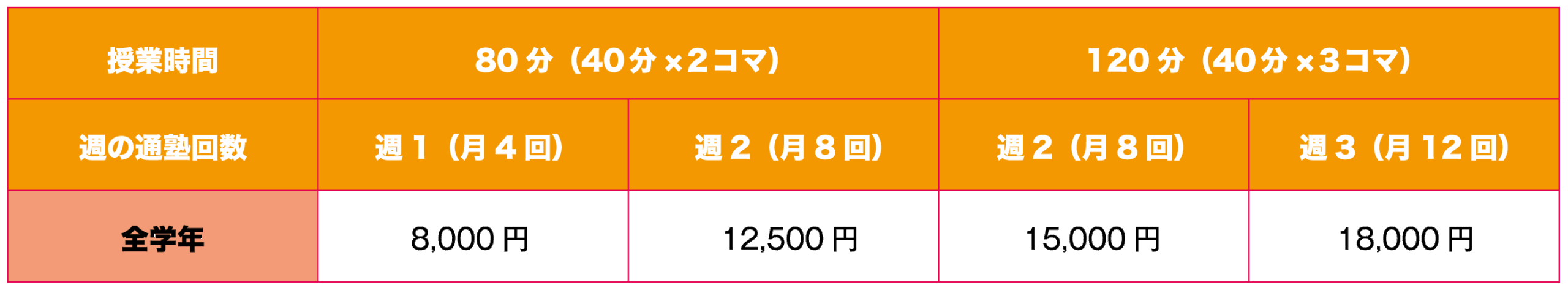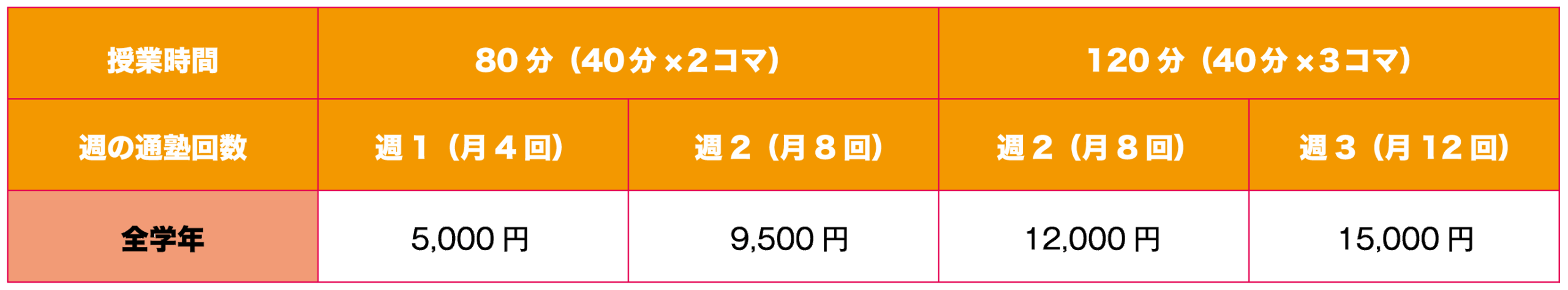 【教材費+諸経費】1年生 年額11,000円 2年生 年額16,500円 3年生 年額23,100円