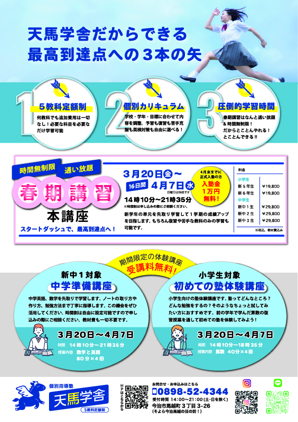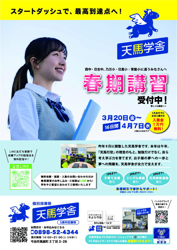 今治市の5教科定額制・個別指導塾「天馬学舎」です。 現在、新学年のスタートを力強くサポートする「春期講習&新規生徒募集キャンペーン」を開催しています!